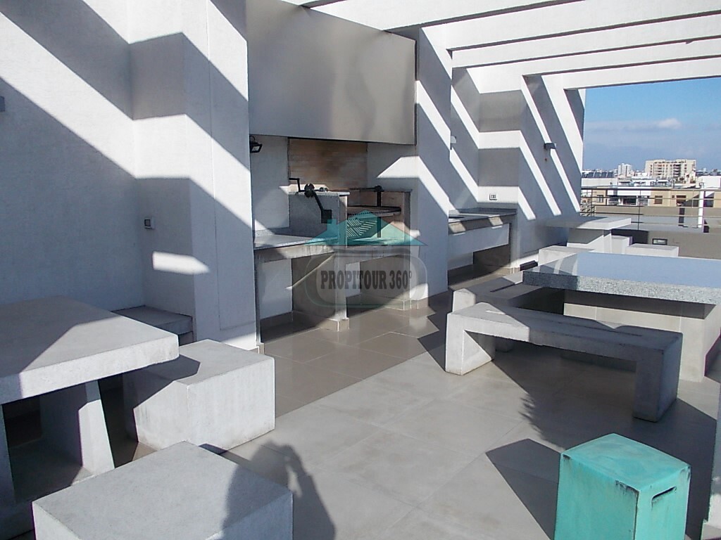 El edificio ofrece excelentes espacios comunes: piscina, gimnasio, quinchos, sala de eventos y lavandería, además de paneles solares que reducen el consumo eléctrico.
